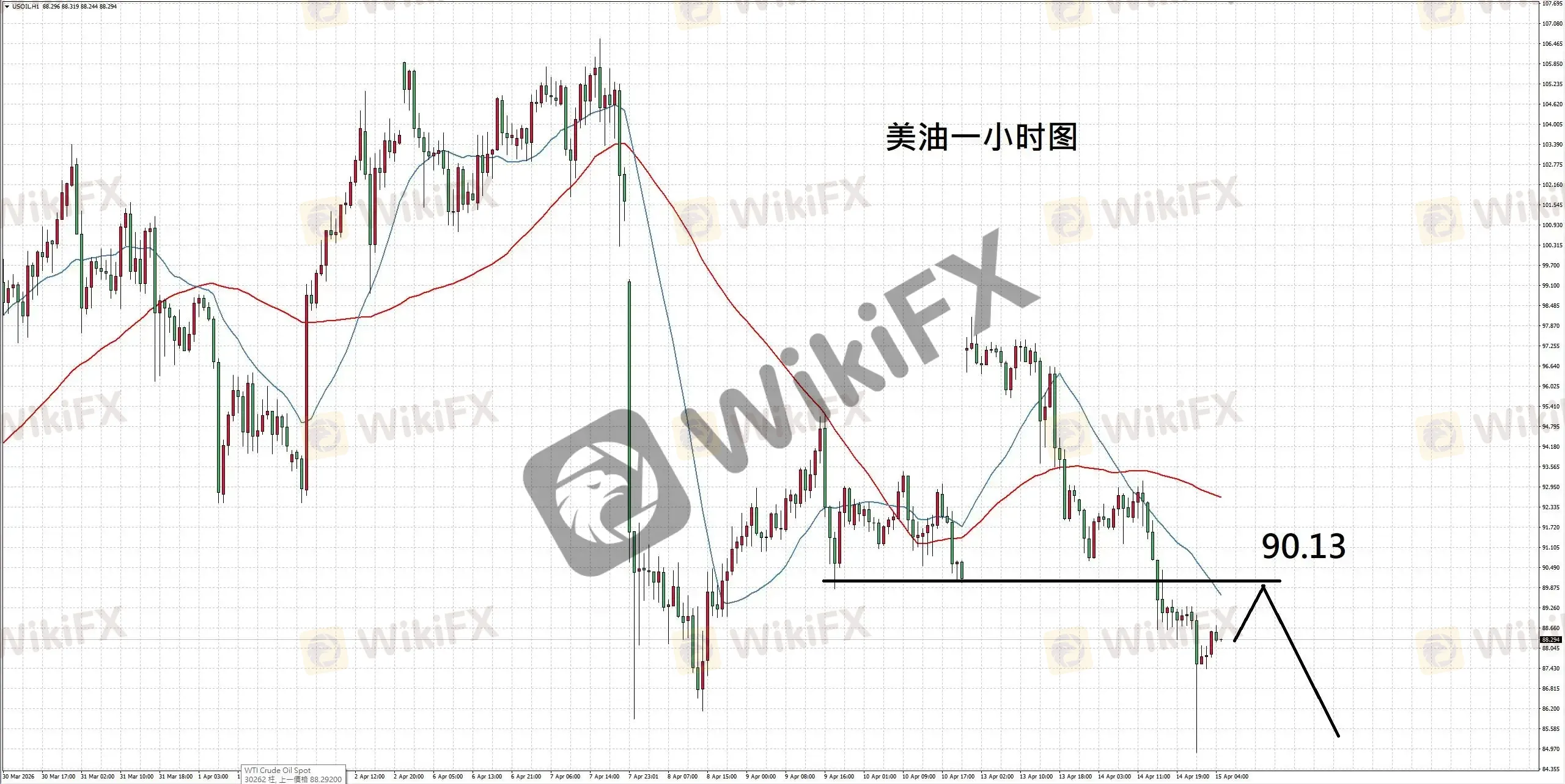 美油一小时图,走势向下跌破震荡区间,并刷新短线低点,反应卖压增强;如后续反弹受阻,则走势或继续向下,故建议短空操作。