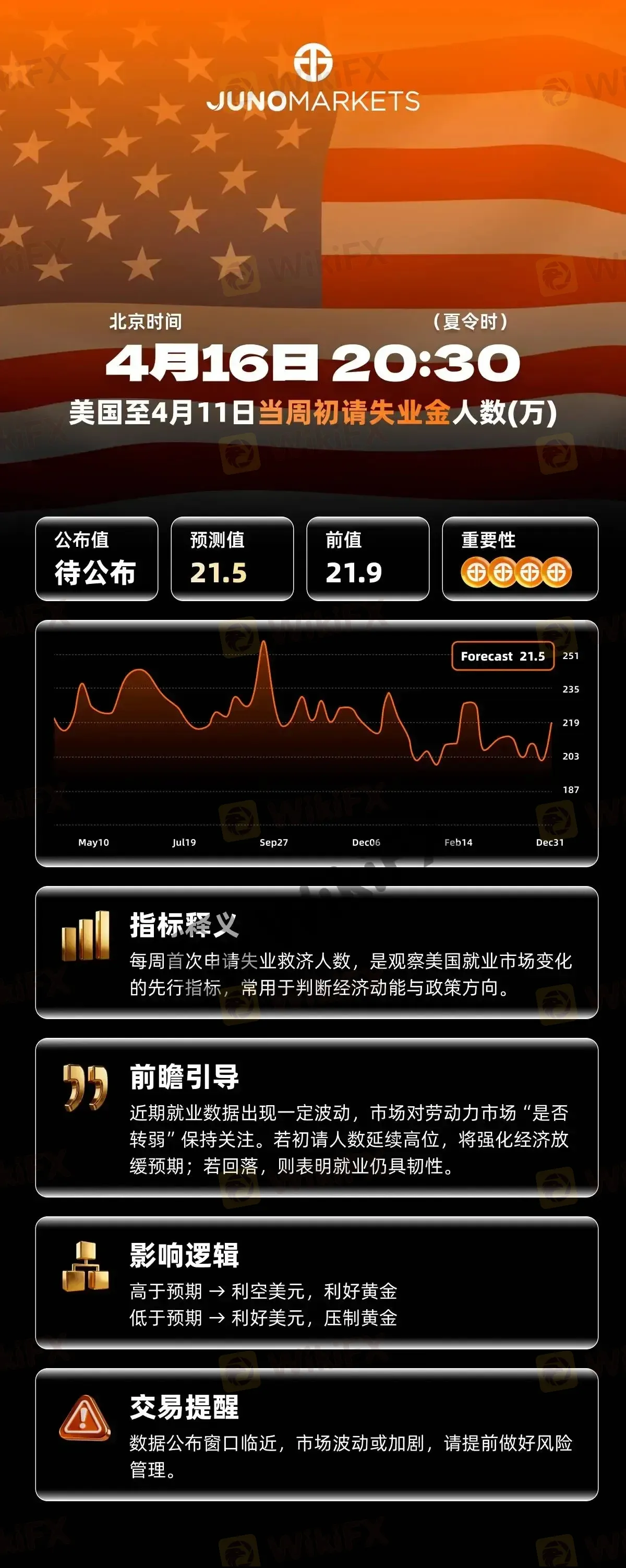 摘要:每周一次的“风向标”——初请失业金数据即将公布。它不只是一个数字,更是观察美国就业市场温度的重要窗口。📊 当数据跳动的那一刻,行情可能放大波动,机会与风险同时登场。Juno Markets 温馨提示:📌 数据公布前后,流动性可能短暂下降,点差扩大需提前留意📌 行情波动加剧,避免盲目追涨杀跌,谨防“来回扫”📌 合理控制仓位,给账户留足缓冲空间📌 提前设好止损,比事后后悔更有意义不论今晚市场
