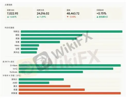 摘要:大盘回顾美伊谈判降温地缘风险,美股全线上扬美股昨夜强势上涨,标普500首次收盘破7000点、纳指连涨11日突破24000点,AI算力链条全面领涨(特斯拉+7.62%领头,微软、博通等大涨),量子计算与核电等外溢方向加速爆发;半导体内部分化明显,阿斯麦因指引不及预期重挫4%;宏观面上,美伊停火谈判进展模糊但市场维持乐观,特朗普扬言解雇鲍威尔则为潜在扰动因素。今日盘前分析AI交易延续,宏观影响回调反而