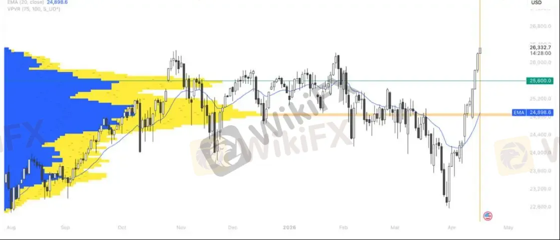 价格在经历前期持续震荡整理后,放量突破25,600关键区间,上方抛压被快速消化,行情转入趋势性拉升。当前价格明显站上EMA并形成加速,叠加成交密集区被有效突破,短线多头占据主导。不过需注意,连续拉升后存在一定乖离率,短期更倾向高位震荡消化获利盘,关注回踩25,600一线的承接力度,若企稳则有望延续上行空间。