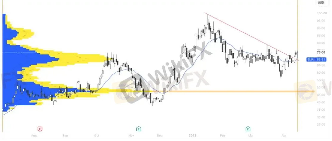 从图表结构来看,RKLB(火箭实验室)当前已完成关键技术突破:价格成功站上68.81 的 EMA 均线,同时彻底突破了自 2026 年初以来的下降趋势线压制,结束了长达 3 个月的震荡下行格局,确认短期趋势由空转多。左侧成交量分布(VPVR)显示,45-50 美元区间为历史强支撑区,当前价格已脱离该成本密集区,上方 75-80 美元为下一阶段阻力,而 EMA 均线已从压力位转为强支撑,为反弹提供了明确的技术底。