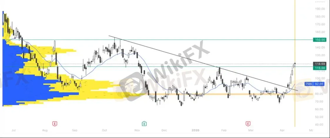 从图表来看,CoreWeave(CRWV)股价已完成多因子共振突破:价格强势击穿了长期压制的下降趋势线,并站稳 92.66 的 EMA 均线,当前 118.69 的价格远离下方 80 美元的成本密集区,多头情绪彻底点燃。左侧成交量分布(VPVR)显示,115 美元一线已转化为坚实的支撑平台,上方阻力直接看向 150 美元整数关口。这一技术突破与消息面形成完美呼应,短期均线拐头向上,量能配合充足,若能维持 115 美元上方的强势震荡,将打开向 130-150 美元区间加速冲刺的主升浪窗口。