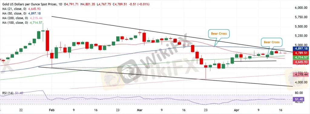 摘要:周五,在未能稳定突破$4800上方后,黄金价格连续第三天保持强势。美元于六周低点回升,因美国-伊朗和平谈判前景不明以及油价反弹。黄金在看跌交叉和中性RSI的背景下,对下跌楔形突破进行试探;关注周线收盘。黄金周五早盘在$4,800下方延续其区间震荡走势,连续第三个交易日未能守在该水平之上。由于贵金属有望录得连续第四周上涨,交易员们仍保持谨慎,等待美国-伊朗和平谈判下一步的明确消息。随着美伊两周停火协